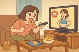 夜のリビング。テレビの通販番組を見て、